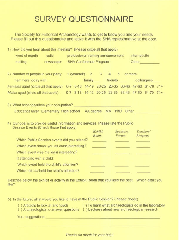 [19] The general Public Session survey form was designed to elicit insight on audience characteristics to allow for better future Public Session planning. One priority was determining how the audience heard about the public session. Also desired was an understanding of how many public session attendees were SHA members as opposed to members of the general public.